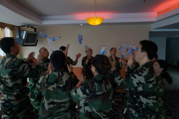 公司全体员工在教练员带领下,在室内进行了第一轮的团队热身项目。现场掌声如雷,一句句鼓舞人心的口号声,刹时间把活动现场沸腾起来······